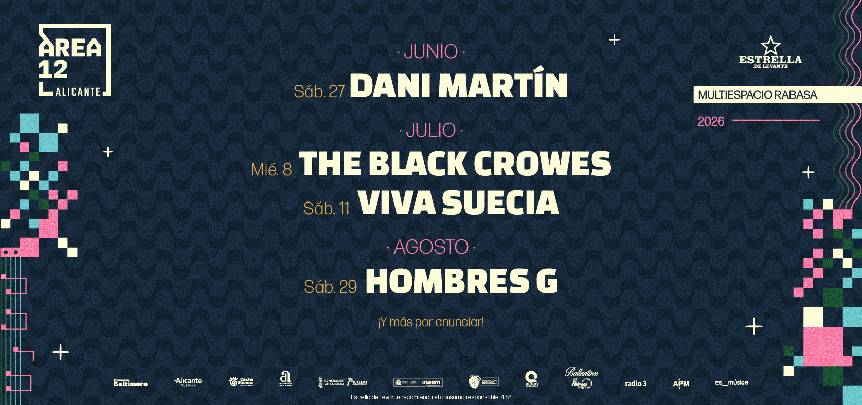 Área 12 Alicante refuerza su programación de grandes conciertos para la próxima temporada con la incorporación de dos nombres destacados: The Black Crowes, el 8 de julio de 2026, y Viva Suecia, el 11 de julio. Estas fechas se suman a la ya anunciada actuación de Dani Martín el 27 de junio, consolidando al recinto como uno de los grandes referentes de la música en directo, tanto en la provincia como en toda la Comunidad Valenciana.